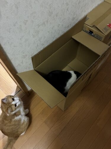 ダンボールの取り合い😾 白黒🐼猫ちゃんVS茶白の🐯猫ちゃん。